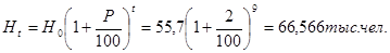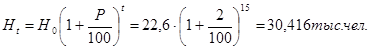 гдеHo - народонаселение в период переписи населения 2010 г., чел;- средний прирост населения в данной местности, % (принимается по данным переписи 2 - 3 %);- период, определяемый как разность между назначенным годом перспективного проектирования и годом переписи населения.