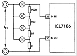 Функция измерения сопротивления и проводимости на основе АЦП серии 7106 реализуется достаточно просто. На рис. 4 изображен один из вариантов измерителя сопротивления. RSTD - это высокоточный (прецизионный) резистор, Rx - резистор, сопротивление которого необходимо измерить. На дисплее будут отображены показания, равные
